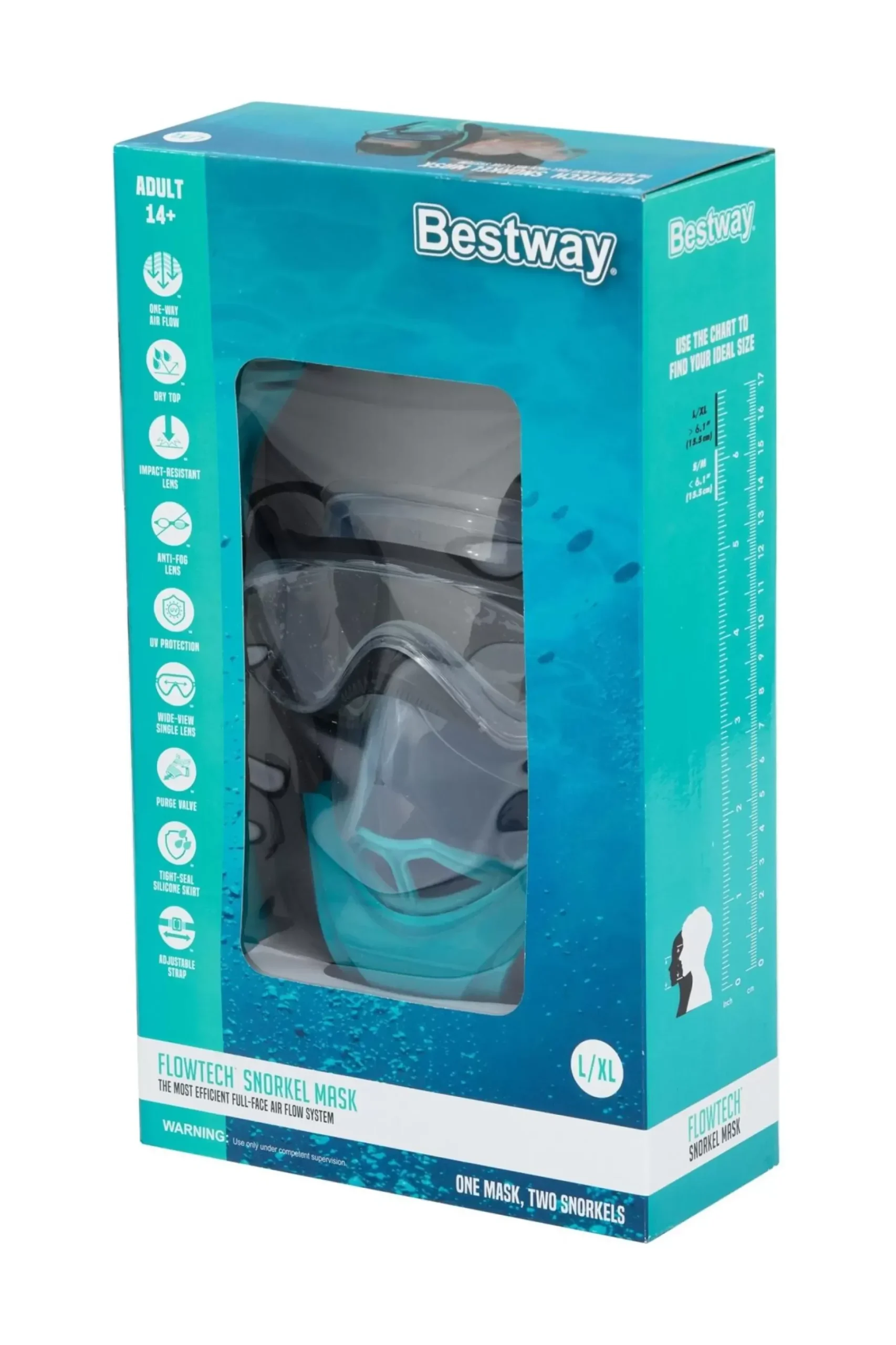 The Bestway® Flowtech™ Full-Face Snorkeling Mask Has The Most Efficient Airflow System Of Its Kind! It’S Perfect For All Your Favorite Water Adventures, Including Snorkeling, Swimming Laps, And Exploring The Open Water. One-Way Airflow Technology:This Innovative, Next-Generation Mask And Snorkel Design Allows You To Breathe Naturally Through Your Nose And Mouth While In The Water. Breathe In The Fresh Air Through One Snorkel And Breathe Out The Co2 Through The Other With The One-Way Airflow Technology.Full Dry Top Technology:The Advanced Dry Top Snorkel Technology Prevents Water From Getting Into The Mask When It Is Submerged. There’S A Small Flotation Device That Seals Off The Top Of The Snorkel, So You Can Dive Under The Water Without Fear Of Getting Water Into The Breathing Area. If Water Does Happen To Make Its Way Into The Snorkel, There Is A Purge Valve For Easy Clearing.Comfortable Fit:The Soft, Silicone Full-Face Structure Sits Comfortably And Securely On Your Head, Allowing You To Breathe Naturally Through Your Nose And Mouth While Also Giving You The Ability To Equalize Pressure As You Descend And Ascend In The Water.For Your Next Snorkeling Adventure, Be Sure To Bring The Bestway Flowtech Full-Face Snorkeling Mask.