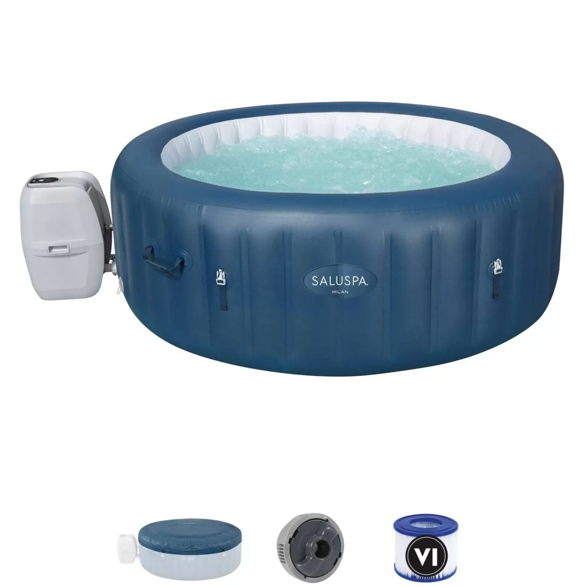 After A Long Day, There’S Nothing More Relaxing Than Sinking Into Warm, Bubbling Water Right In Your Own Backyard. The Saluspa® Milan Airjet Plus™ Provides An Enhanced, Soothing Massage Experience For Up To 6 People, While Still Being Quick And Easy To Set Up. This Spa Reaches Up To 104ºf (40ºc) To Provide Ultimate Relaxation As You Are Surrounded By 140 Airjet Massage Bubbles. Simply Attach The Pump And Watch As It Inflates. Control At Your Fingertips: This Unique Spa Can Be Controlled From Your Smart Device Through The Bestway Smart Hub™ App. This New Innovation Makes The Milan One Of The Most Convenient Spas On The Market. The App Lets You Set Your Spa To The Perfect Temperature, Activate The Power Saving Timer, Run The Water Filter And Control The Airjet Plus Massage System – All From The Palm Of Your Hand. Soothing Massage System: 140 Airjet Plus Bubbles Are Released From The Center And Sides Of The Bottom Of The Spa To Target Your Legs And Back With A Soothing Massage. Designed To Provide The Ultimate Comfort And Relaxation Experience, This Massage System Features Two Intensity Levels, So Your Relaxation Time Is Completely Customizable.Durable Construction:This Spa’S Inflatable Walls Are Made Of Durable, Puncture-Resistant, Duraplus™ Material Which Prevents Damage. Compared To Pvc, Duraplus 3-Layer Material Is 33% More Tear Resistant And 56% More Stretch Resistant. This Type Of Internal Construction Prevents Expansion Over Time, Allowing The Spa To Retain The Same Shape No Matter How Many Times It’S Inflated And Deflated.Innovative Winterizing Technology:The Included Freeze Shield™ Automatic Heating Function Prevents Inner Components From Freezing During Colder Temperatures. Designed With Innovative Winterizing Technology, The System Will Keep The Internal Temperatures Between 42º And 50ºf (6º And 10ºc) To Prevent Damage.Electrical Safety Information:Our Spas Feature A Ground Detection System That Ensures The Spa Is Used With An Outlet Having A Proper Ground Connection, Providing Additional Electric Current Protection. Only Use A Grounded Socket Corresponding To The Electrical Rating Of The Attachment Plug. Never Use An Extension Cord Or Multi-Plug Adaptor. Be Sure To Regularly Inspect Both The Plug And Socket For Signs Of Damage, And Do Not Plug The Product Back Into The Socket If Damage Is Found. Read The Manual Thoroughly Before Setting Up Your Hot Tub.Contents: Equipped With A Pump That Quickly Inflates The Spa, Heats It Up, Runs Filtration And Controls The Massage System, This Spa Is Both Easy And Convenient. The Pump Can Easily Be Reached From Inside The Spa And Features Cup Holders For Drinks And Snacks. Also Included Is A Chemconnect™ Dispenser That Maintains Clean, Healthy Water By Evenly Dispersing The Proper Amount Of Chlorine. To Top It All Off, The Milan Spa Comes With A Reinforced Cover That Locks In Heat While Not In Use, As Well As Keeping Dust And Debris From Collecting On The Water.The Original Premium Portable Spa™:Saluspa Is The Original Manufacturer Of The World’S First Premium Portable Spa. A Little Over A Decade Of Advanced Engineering Innovations Have Built A Name That Consumers Have Grown To Trust.