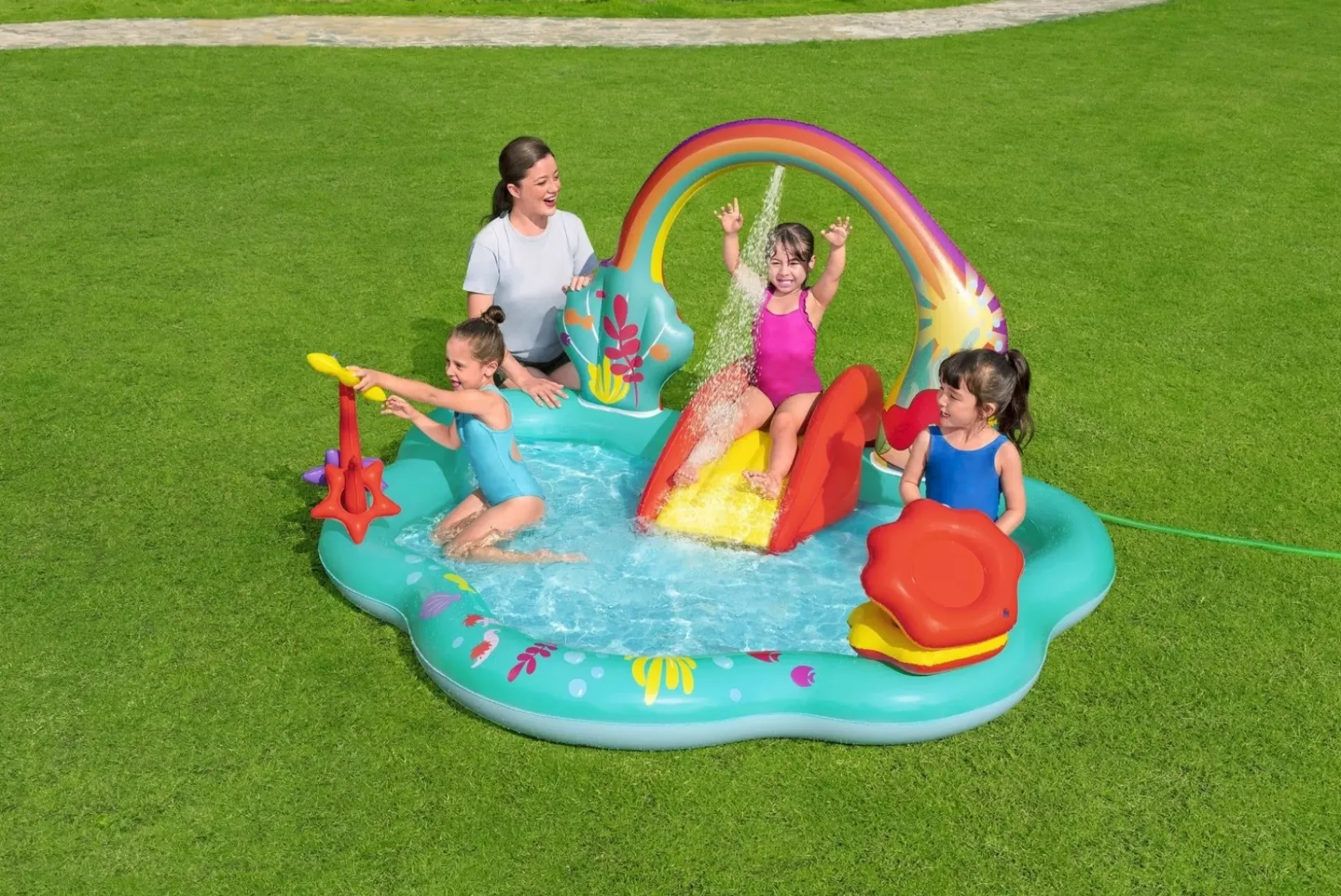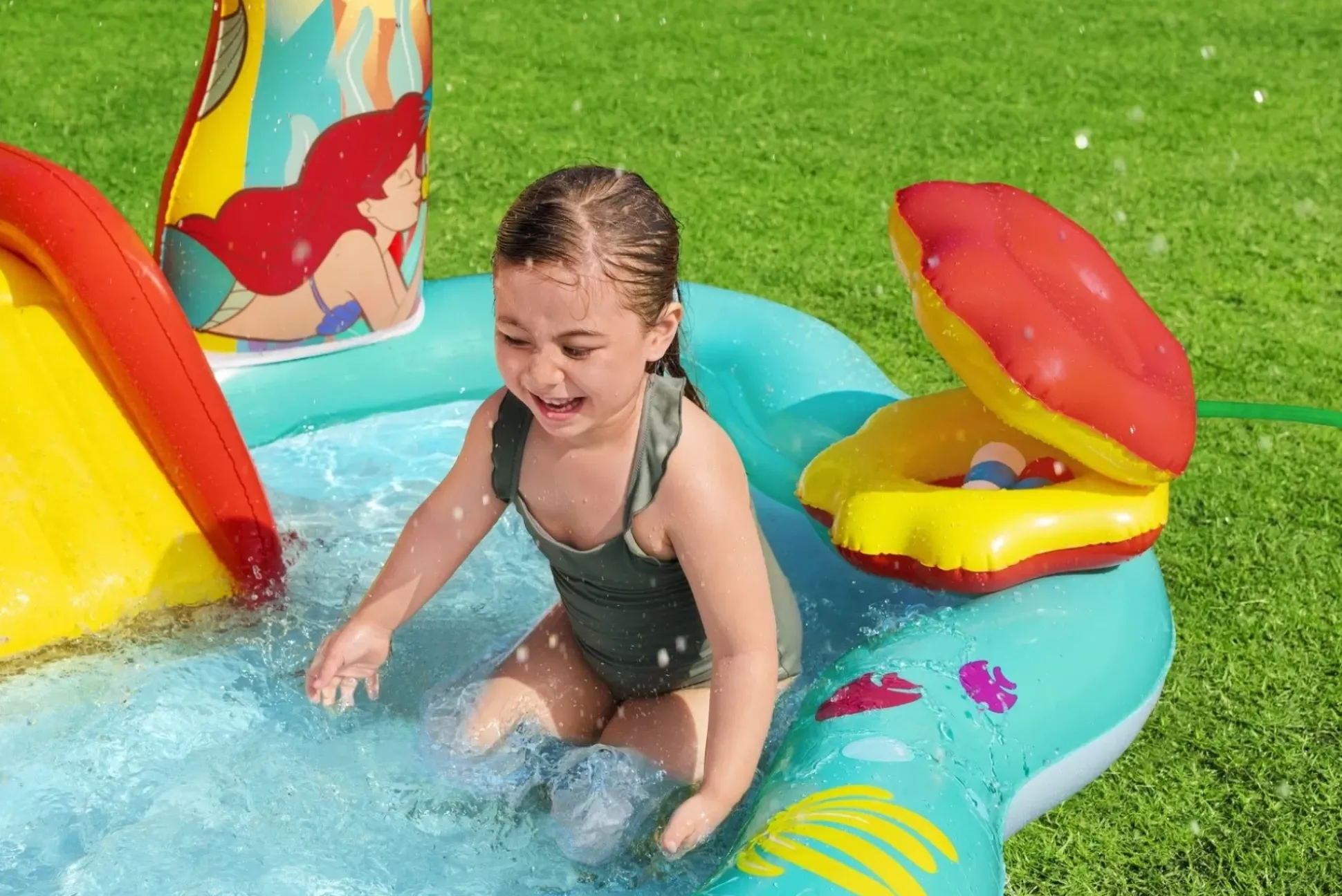Get Ready For An Undersea Adventure With The Disney® Little Mermaid Inflatable Kids Water Play Center! Simply Inflate The Play Center And Fill The Pool With Water, Attach A Garden Hose (Not Included) To The Archway To Activate The Sprayer, And Let The Exploration Begin.Featuring A Built-In Slide Fused To The Bottom For Extra Safety And Security, The Rainbow Arch Sprays Water As Your Kids, Ages 2 And Up, Splash Into A Lagoon And Slide Into The Pool Below. Watch As They Make Waves Tossing 3 Star-Shaped Rings In A Friendly Game Of Coral Ring Toss. Or, They Can Take Turns Playing The Seashell Ball Toss Game With The 6 Included Balls To See Who Can Score The Most Points. When The Kids Are Done Splashing And Playing, Release The Pool Water With The Easy-To-Use Drain Valve.Enjoy The Play Center With Or Without Water For Year-Round Fun And Excitement. The Little Mermaid Is Always Ready To Go On A New Adventure!