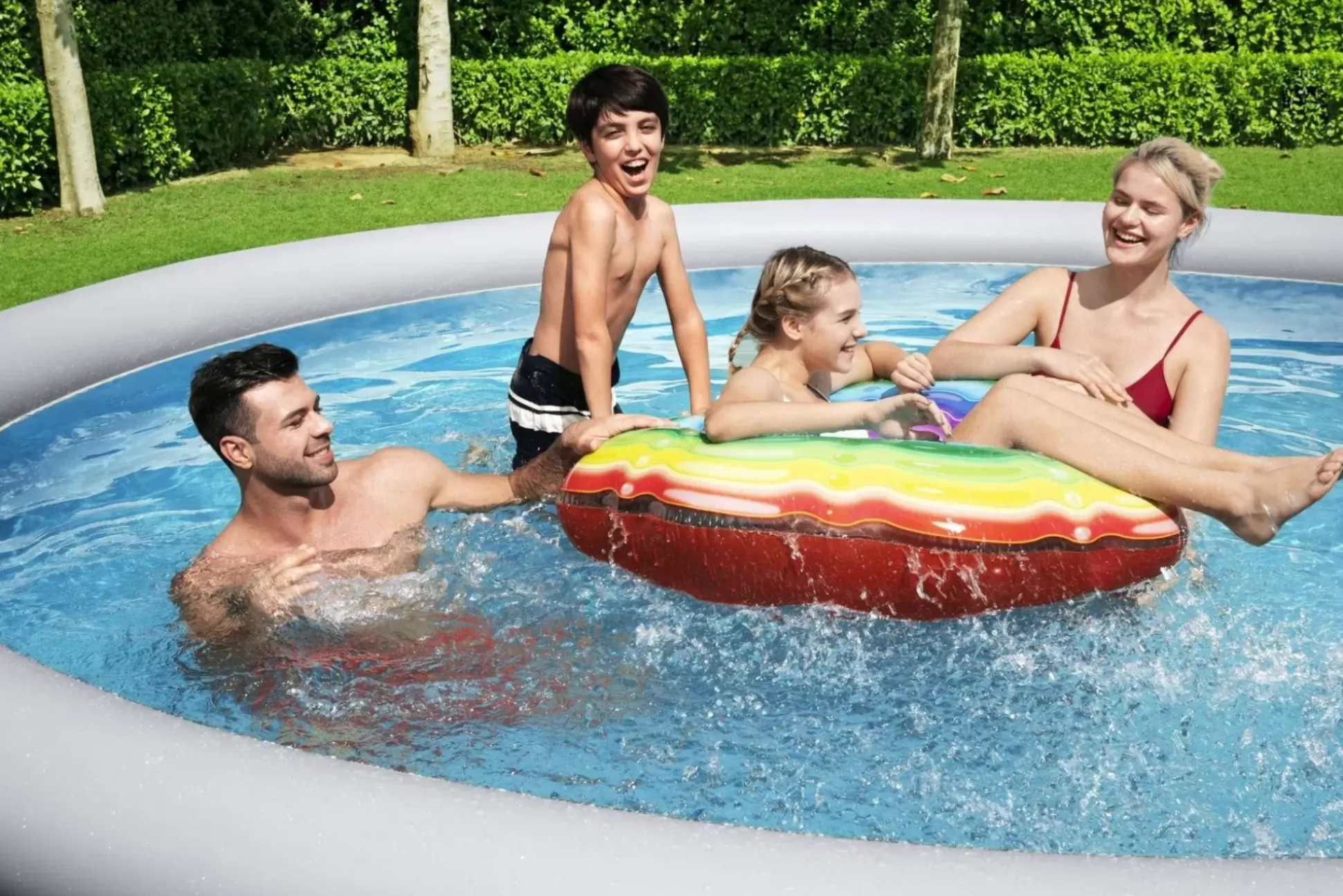 With This Quick And Easy Bestway® Fast Set™ Pool Set, You’Ll Be Ready For A Pool Day In No Time! The Fill & Rise Set-Up Process Is Simple – Just Select A Level Surface, Inflate The Top Ring And The Pool Will Rise As It’S Filled Up With Water. The Sturdy Duraplus™ Liner Is Made Out Of An Ultra-Durable 3-Layer Material That Is Reinforced For Strength And Is 85% More Puncture-Resistant Than Pvc. The Attractive Liner Also Features A Realistic Rattan Print That Will Bring A Classy Look And Feel To Your Backyard. When The Season’S Over, Storage Is Fast And Simple. The Water Releases Easily Through The Flow Control Drain Valve, And Then The Pool Can Fold Up For Compact Off-Season Storage. Also Included With The Set Is A Filter Pump To Help Keep The Water Clean. This Pool Is The Ideal Choice For Families Looking For A Quick And Easy Pool Option For Their Backyard. Kids Will Enjoy Spending Their Summer Days Splashing And Playing In The Water, And Parents Can Enjoy A Nice And Relaxing Dip As Well. The Season Won’T Be Complete Without The Convenient Fast Set Pool From Bestway!