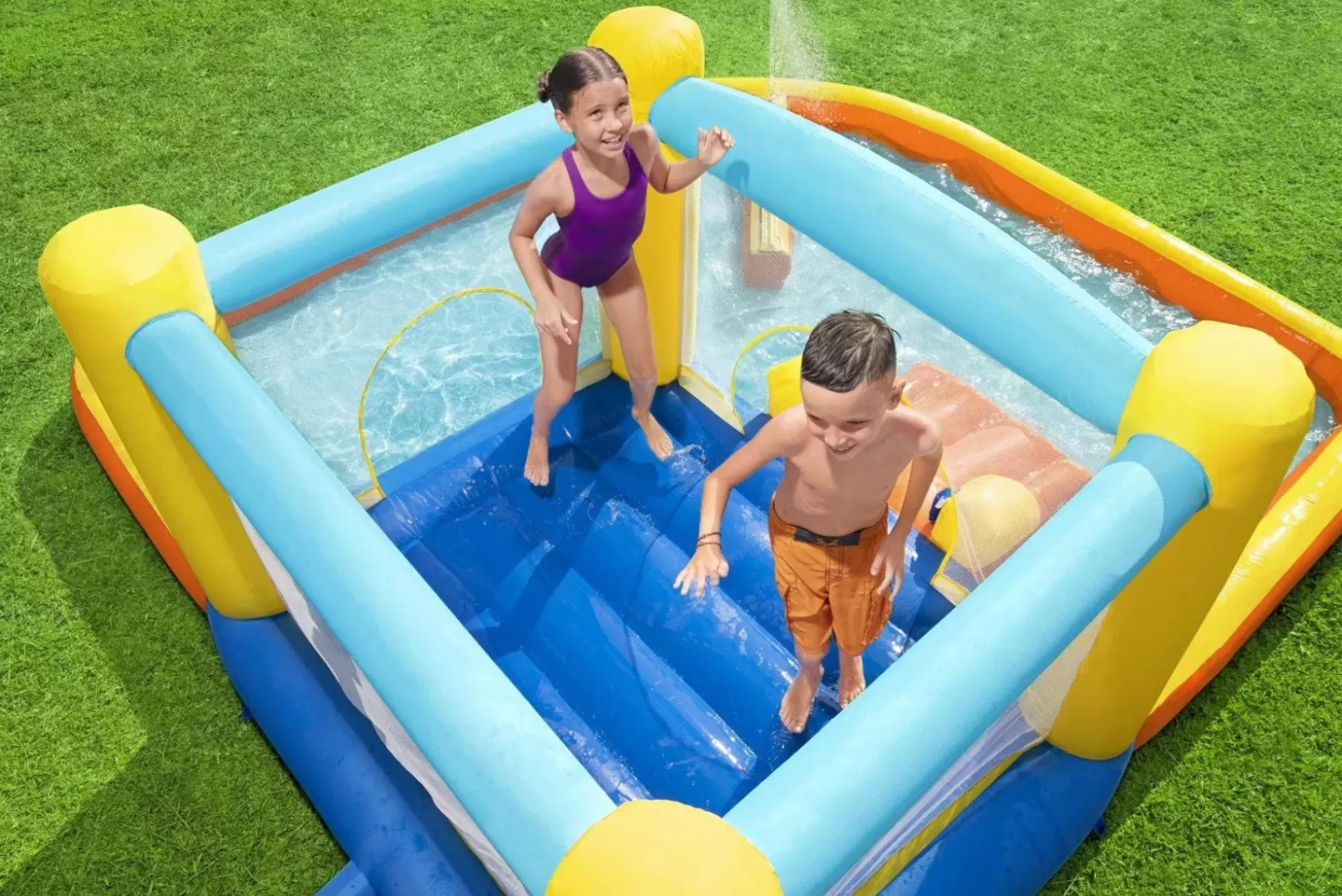 Bring Bouncy Fun Right To Your Own Backyard With The H2Ogo!® Beach Bounce Inflatable Water Park! This Fun Park Will Be The Talk Of The Entire Neighborhood, Especially Since It Inflates In Less Than 2 Minutes Using The Included Blower. The Giant Bouncer With Mesh Safety Walls Is Perfect For Energy-Filled Kids To Jump And Play In The Great Outdoors. Featuring A Slide That Leads Into The Giant Splash Pool, And A Sprinkler That Creates A Wall Of Water For Kids To Run And Jump Through, Your Little Ones Will Have So Much Fun That They’Ll Beg To Go Outside And Play Everyday! Double-Stitched For Increased Durability, The H2Ogo! Beach Bounce Inflatable Water Park Is Perfect For Parties, Get-Togethers And Hot Summer Days Year After Year!