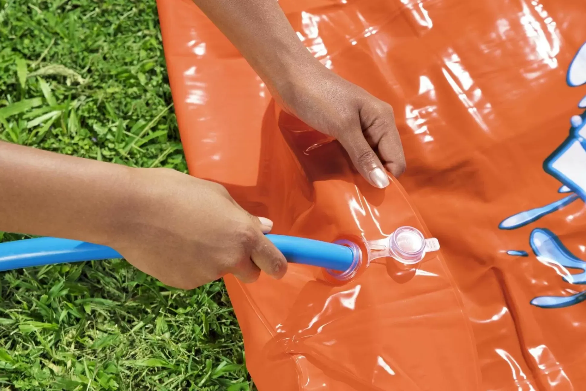 The H2Ogo!® Tsunami Splash Ramp™ Double Slide Will Create Endless Rides, Smiles, And Backyard Summer Fun! This 16 Ft. Double Slide Has A Tsunami Splash Ramp That Pushes Waves Of Water From Underneath The Ramp Creating An Incredibly Smooth, Fast And Wet Ride! The Tsunami Splash Ramp Also Creates A Soft Landing And Increases Speed With Every Slide. Combined With The Splashboost™ Sprinkler Technology, A System Built-In To Provide Targeted Water Coverage To Optimize Sliding, Spraying And Splashing, Kids Will Be Lining Up To Race Their Friends. With Water That Funnels Into A Big Splash Landing At The Finish Line, The Tsunami Splash Ramp Double Slide Is Designed To Keep Kids Cool And Create Wave After Wave Of Fun. The Quick And Easy Set-Up And Simple Takedown Of This Awesome Slide Will Have Both Parents And Kids Cruising Full-Speed Into A Summer Of Good Times.