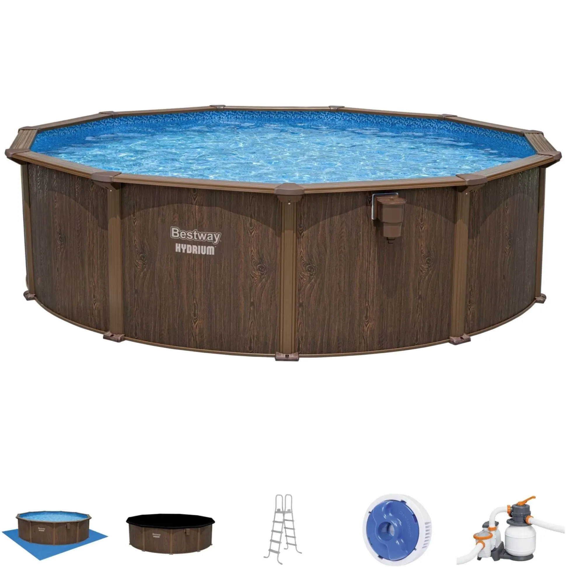 The Bestway® Hydrium™ Steel Wall Above Ground Pool Set Is Perfect For Families Looking For A More Affordable, Permanent Option To Incorporate Into Their Backyard! With Its Ultra-Durable Construction And Innovative Features, This Pool Is Meant To Last Season After Season. With Proper Maintenance, A Hydrium Pool Will Give Your Family Plenty Of Summer Swimming Memories!Durable Construction:Constructed With Corrosion-Resistant Galvanized Steel, This Pool Is Built For Longevity. The Walls, Top Ledge And Frame Are All Made From 100% Steel, Which Is Then Coated In A Layer Of Zinc To Prevent Rust And Damage From Weather Elements. The Unique Steel Ridge Design Along The Pool Wall Provides Extra Support To Ensure Your Pool Is Always In Top-Notch Shape. Along The Inside Of The Pool, The Attractive Prismatic Stone™ Liner Features A Uv-Resistant Coating To Prevent Discoloration Or Cracking Under The Sun.Semi-Permanent Diy Setup:The Durable Construction Materials Allow The Pool To Remain In Your Backyard All Year Long, So You Can Easily Incorporate It Into Your Landscaping. No Need To Take It Down And Reconstruct It Next Year. The Diy Steel Wall Pool Kit Includes Almost Everything You Need To Set It Up – All You Need Is A Screwdriver, Wrench And A Knife!Additional Features:This Pool Set Comes With A Sand Filter, A Surface Skimmer, A Ladder, A Ground Cloth, A Pool Cover And A Chemconnect™ Chemical Dispenser. The Sand Filter Is A Good Alternative To A Traditional Cartridge Filter Pump With A Longer Lifespan, And The Surface Skimmer Attaches To The Side Of The Pool To Work With The Filter To Remove Unwanted Debris From The Water. The Chemconnect Chemical Dispenser Provides A Stable Level Of Chlorine All Throughout The Pool.