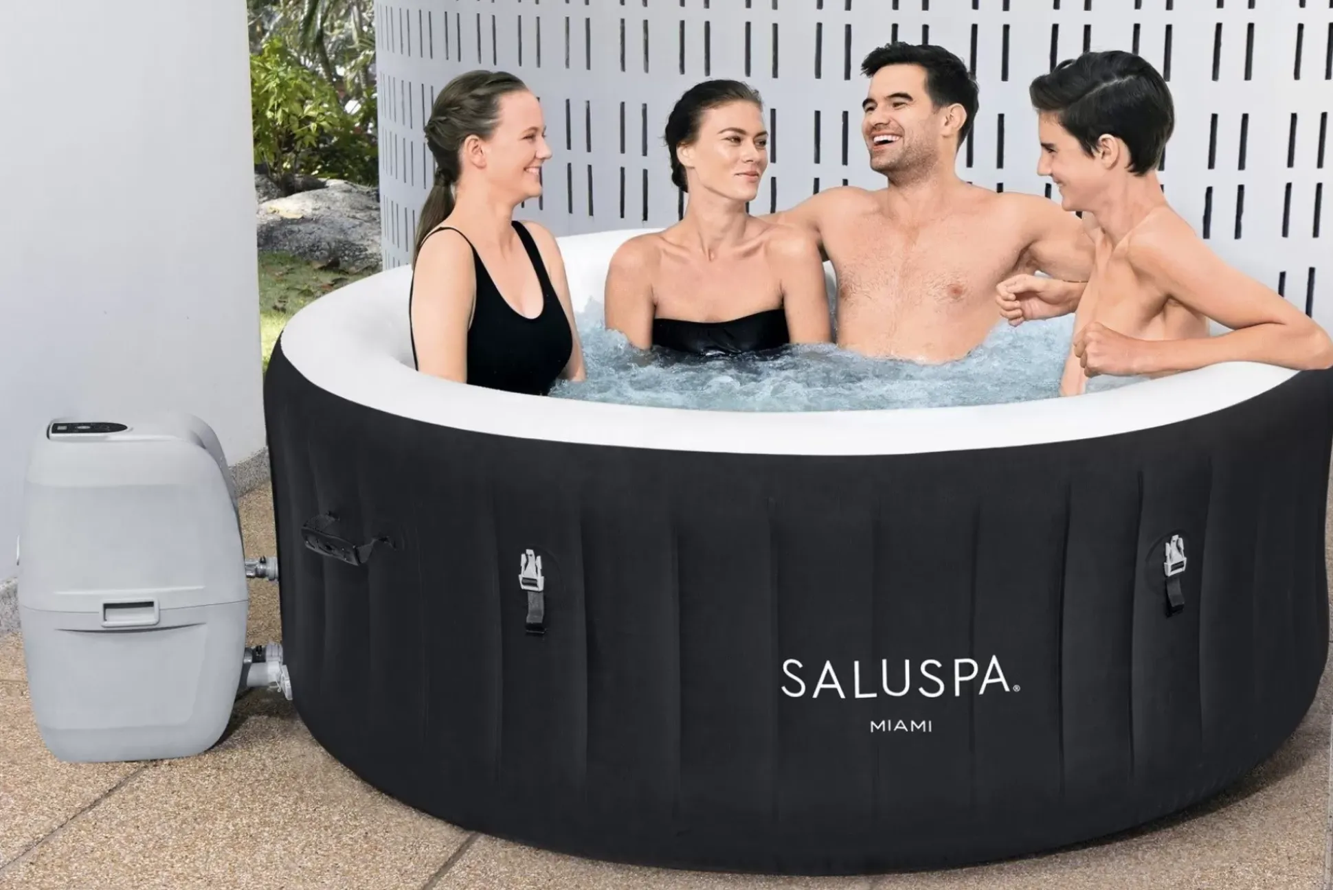 After A Long Day, There’S Nothing More Relaxing Than Sinking Into Warm, Bubbling Water Right In Your Own Backyard. The Saluspa® Miami Energysense Airjet™ Provides A Soothing Massage Experience For Up To 4 People, While Still Being Quick And Easy To Set Up. This Spa Reaches Up To 104ºf (40ºc) To Provide Ultimate Relaxation As You Are Surrounded By 120 Airjet Massage Bubbles. Simply Attach The Pump And Watch As It Inflates. Increased Energy-Efficiency: This Spa Includes Two Insulated Covers For You To Choose From – A Standard Cover And A Specially Constructed Energysense® Cover. The Energysense Cover Is Up To 40% More Energy-Efficient Than Similar Inflatable Spas, So Your Water Stays Hot And Your Energy Bill Stays Low.Soothing Massage System:The Airjet System Features 120 Jets Which Release Bubbles From The Bottom Of The Spa To Create A Warm, Bubbling Hot Tub Environment. These Soothing Bubbles Will Help You Relax And Unwind Right From The Comfort Of Your Home. Durable Construction:The External Wall Is Constructed With 3-Layer Duraplus™ Material, Proven To Be Both Puncture And Damage Resistant. This Material Offers Exceptional Stretch Resistance, Allowing The Spa To Maintain Its Intended Shape Over Time, No Matter How Many Times You Inflate And Deflate It.Innovative Winterizing Technology:The Included Freeze Shield™ Automatic Heating Function Prevents Inner Components From Freezing During Colder Temperatures. Designed With Innovative Winterizing Technology, The System Will Keep The Internal Temperatures Between 42º And 50ºf (6º And 10ºc) To Prevent Damage.Electrical Safety Information:Our Spas Feature A Ground Detection System That Ensures The Spa Is Used With An Outlet Having A Proper Ground Connection, Providing Additional Electric Current Protection. Only Use A Grounded Socket Corresponding To The Electrical Rating Of The Attachment Plug. Never Use An Extension Cord Or Multi-Plug Adaptor. Be Sure To Regularly Inspect Both The Plug And Socket For Signs Of Damage, And Do Not Plug The Product Back Into The Socket If Damage Is Found. Read The Manual Thoroughly Before Setting Up Your Hot Tub.Contents:Equipped With A Pump That Quickly Inflates The Spa, Heats It Up, Runs Filtration And Controls The Massage System, This Spa Is Both Easy And Convenient. The Pump Can Easily Be Reached From Inside The Spa And Features Cup Holders For Drinks And Snacks. Also Included Is A Chemconnect™ Dispenser That Maintains Clean, Healthy Water By Evenly Dispersing The Proper Amount Of Chlorine. The Original Premium Portable Spa™:Saluspa Is The Original Manufacturer Of The World’S First Premium Portable Spa. Over A Decade Of Advanced Engineering Innovations Have Built A Name That Consumers Have Grown To Trust.