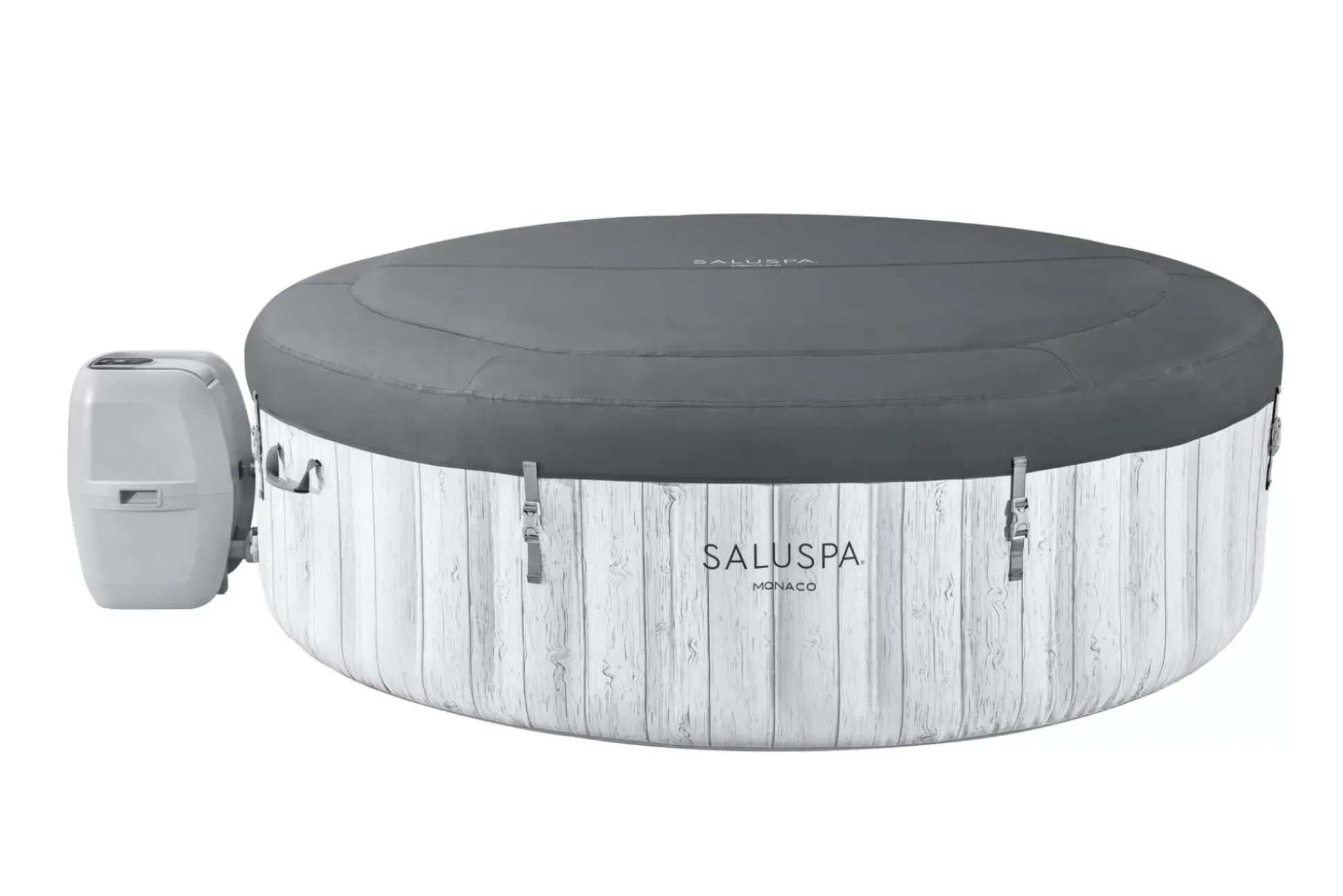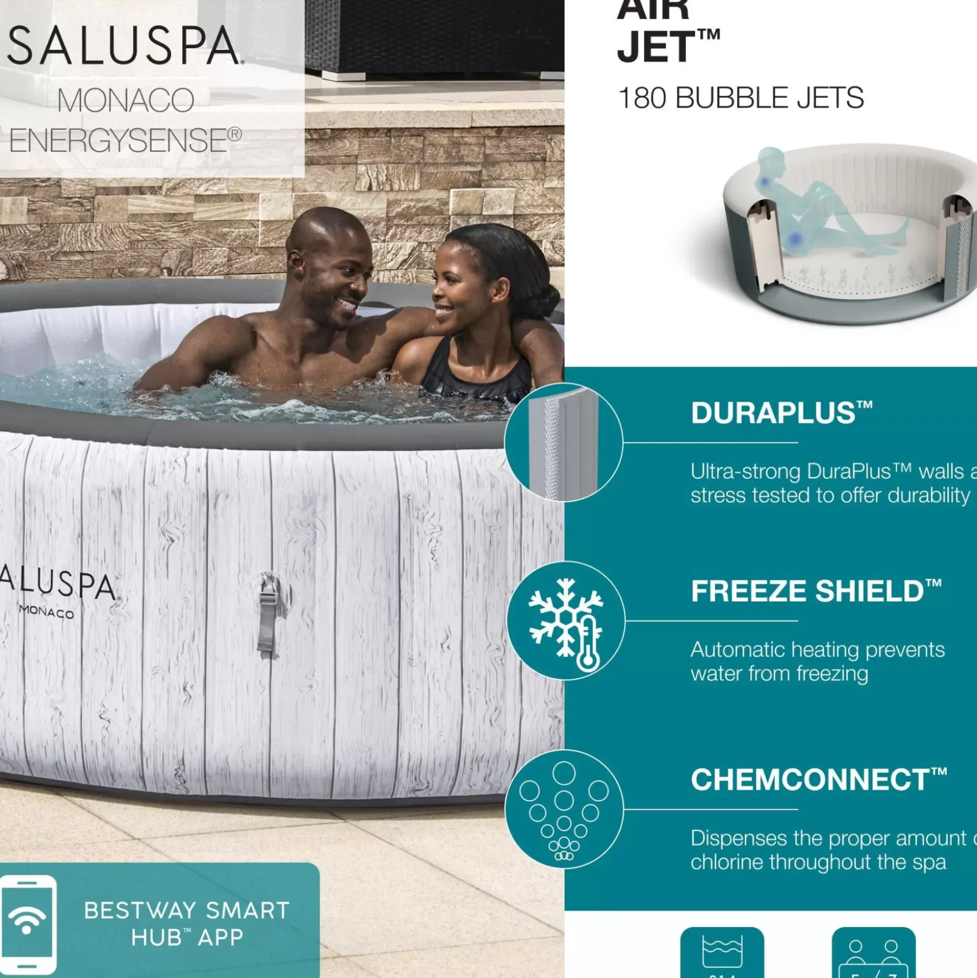 After A Long Day, There’S Nothing More Relaxing Than Sinking Into Warm, Bubbling Water Right In Your Own Backyard. The Saluspa® Monaco Energysense Airjet™ Provides A Soothing Massage Experience For Up To 7 People, While Still Being Quick And Easy To Set Up. This Spa Reaches Up To 104ºf (40ºc) To Provide Ultimate Relaxation As You Are Surrounded By 180 Airjet Massage Bubbles. Simply Attach The Pump And Watch As It Inflates.Increased Energy-Efficiency:This Spa Includes Two Insulated Covers For You To Choose From – A Standard Cover And A Specially Constructed Energysense® Cover. The Energysense Cover Is Up To 40% More Energy-Efficient Than Similar Inflatable Spas, So Your Water Stays Hot And Your Energy Bill Stays Low. Control At Your Fingertips: This Unique Spa Can Be Controlled From Your Smart Device Through The Bestway Smart Hub™ App. This Innovation Makes This Monaco One Of The Most Convenient Spas On The Market. The App Allows You To Set Your Spa To The Perfect Temperature, Activate The Power Saving Timer, Run The Water Filter And Control The Airjet Massage System – All From The Palm Of Your Hand, Wherever You Are. Soothing Massage System: The Airjet System Features 180 Jets Which Release Bubbles From The Bottom Of The Spa To Create A Warm, Bubbling Hot Tub Environment. These Soothing Bubbles Will Help You Relax And Unwind Right From The Comfort Of Your Home. Designed To Provide The Ultimate Comfort And Relaxation Experience, This Massage System Features Two Intensity Levels, So Your Relaxation Time Is Completely Customizable.Durable Construction: Maxhold™ Fabric Internal Beams Provide Superior Air Pressure Retention, Stability And Lightweight Portability. This Construction Offers Exceptional Stretch Resistance, Allowing The Spa To Maintain Its Intended Shape Over Time, No Matter How Many Times You Inflate And Deflate It. Surrounded By A 3-Layer Duraplus™ Outer Layer, This Spa Is Proven To Be Puncture And Damage Resistant. Innovative Winterizing Technology:The Included Freeze Shield™ Automatic Heating Function Prevents Inner Components From Freezing During Colder Temperatures. Designed With Innovative Winterizing Technology, The System Will Keep The Internal Temperatures Between 42º And 50ºf (6º And 10ºc) To Prevent Damage.Prioritizing Safety:Our Spas Feature A Ground Detection System That Ensures The Spa Is Used With An Outlet Having A Proper Ground Connection, Providing Additional Electric Current Protection.Contents: Equipped With A Pump That Quickly Inflates The Spa, Heats It Up, Runs Filtration And Controls The Massage System, This Spa Is Both Easy And Convenient. The Pump Can Easily Be Reached From Inside The Spa And Features Cup Holders For Drinks And Snacks. Also Included Is A Chemconnect™ Dispenser That Maintains Clean, Healthy Water By Evenly Dispersing The Proper Amount Of Chlorine. The Original Premium Portable Spa™:Saluspa Is The Original Manufacturer Of The World’S First Premium Portable Spa. Over A Decade Of Advanced Engineering Innovations Have Built A Name That Consumers Have Grown To Trust.