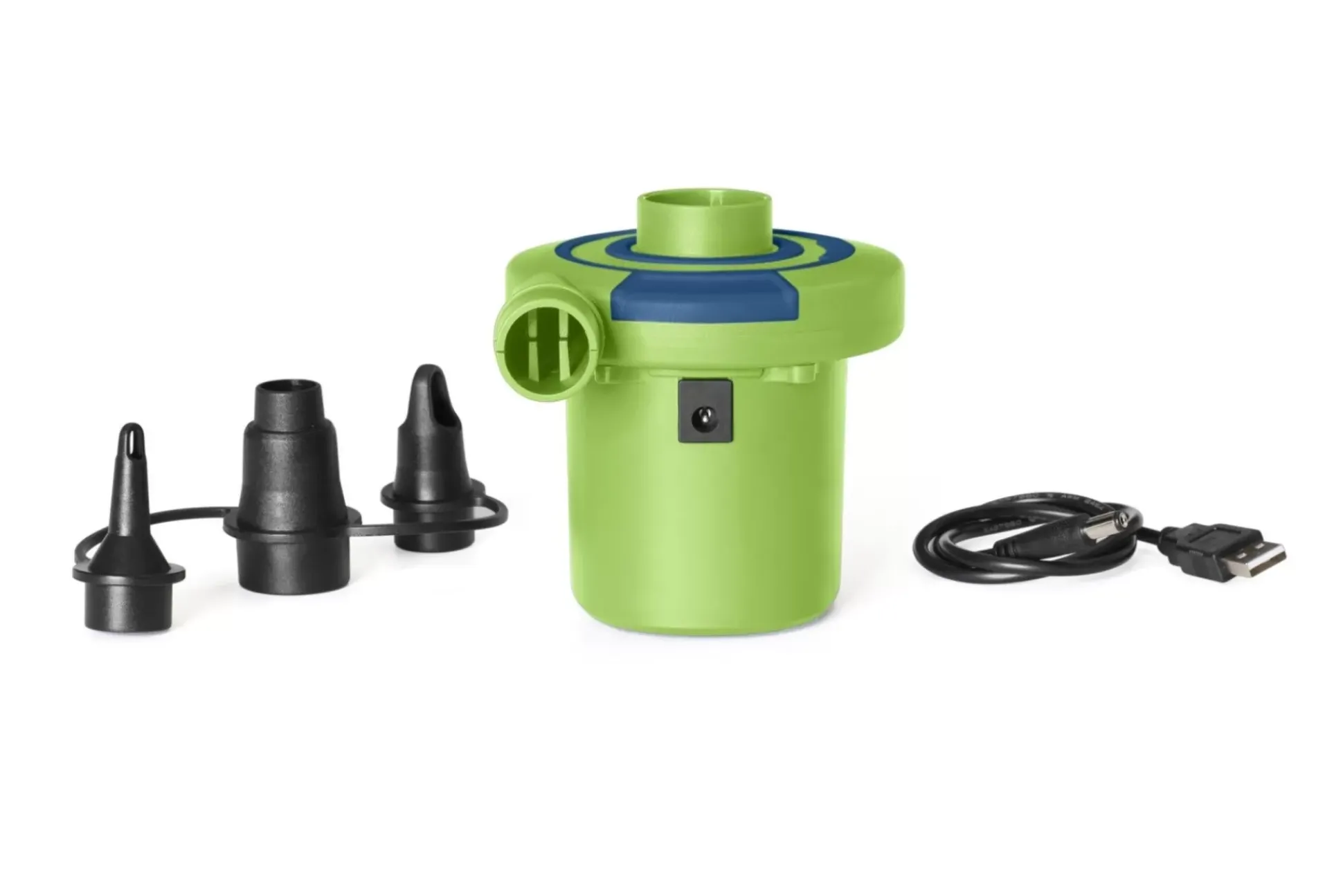 The Bestway Sidewinder 4.8V Green Rechargeable Electric Air Pump Inflates Most Air Mattresses, Pool Floats, Swim Rings, Beach Balls And Other Inflatable Toys. Designed To Provide Maximum Airflow, This Sturdy, Two-Color Pump Has An Airflow Rate Of 565 L/Min, A Maximum Pressure Of 370 Mmh20 And Recharges Using A Usb Cord. It Also Includes Four 1500Ma Built-In Rechargeable Batteries. Plus, Three Universal Valve Adapters Are Included To Fit Nearly Every Inflation Valve, So You’Re Able To Inflate A Variety Of Items With The Same Pump! The Sidewinder 4.8V Rechargeable Electric Air Pump Is Great For Inflating Your Items At Home Or Even On-The-Go! Model #62239E