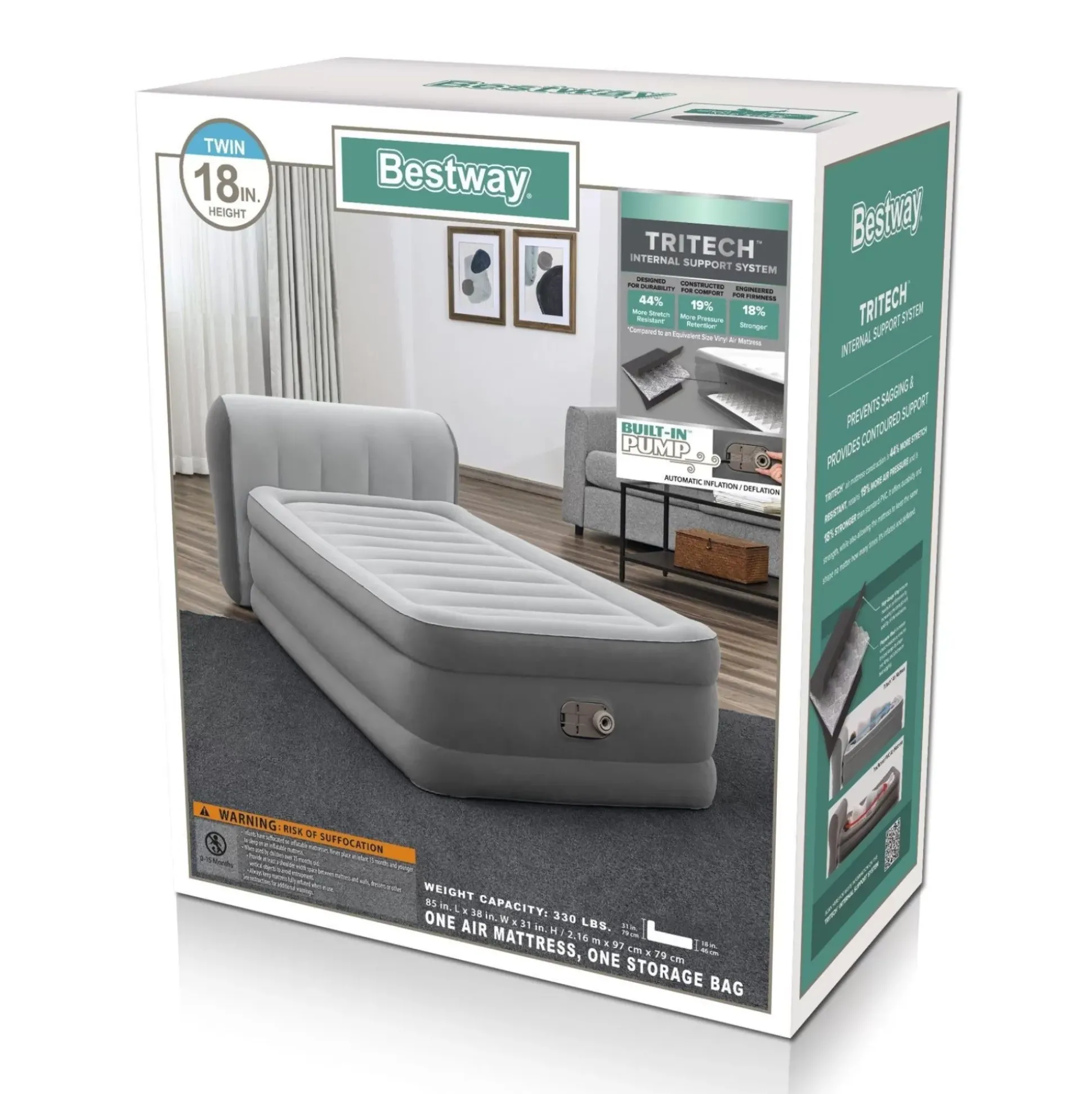 Wake Up Renewed And Refreshed On The Bestway® Tritech™ Air Mattress With Headboard! This Twin-Sized Bed Promises Strength, Durability And Comfort All Night Long. The Headboard Is Perfect For Leaning Back And Relaxing. Its Compact Size And Built-In Pump Make It Quick And Convenient For Use Whenever You Need It. Plus, With The Ultra-Fresh™ Antimicrobial Treatment, Your Bed Will Be Protected From The Growth Of Odor-Causing Bacteria, Mold And Mildew On The Sleep Surface.Durable Construction:With A Comfortable Flocked Sleeping Surface And Sturdy Construction, A Great Night’S Sleep Is Right Around The Corner. The Internal Structure Of This Bed Is Made With Tritech™ Material Offering Durability And Strength, While Also Allowing The Mattress To Keep The Same Shape No Matter How Many Times It’S Inflated And Deflated. This Premium Grade Material Increases Internal Stretch-Resistance And Provides Contoured Support For All Night Comfort. Engineered To Provide A Flat, Comfortable Sleeping Surface And An Elegant Look, The Unique Wave Beam Design Ensures You Get A Great Night’S Sleep And Ultimate Comfort.Simple Setup:The Built-In Ac Air Pump Inflates The Mattress In 3-4 Minutes, So It Is Ready For Bed When You Are. In The Morning, The Quick Release Screw Valve Allows For Easy Deflation. Simply Place Your Flattened Bed In The Included Carry Bag For Easy Transport And Storage.